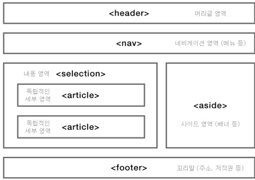 | <article> | 독립적인 콘텐츠를 정의 예시로 신문기사나 포럼 게시물들을 권장 <h2>~<h6> tag를 하나 이상 사용하는 것을 권장 |
