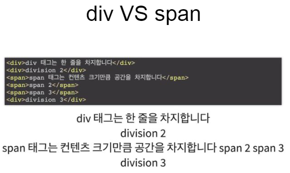 | <span> | 하나의 태그를 여러 개로 나누어 묶음. 컨텐츠의 크기만큼 공간을 차지 |