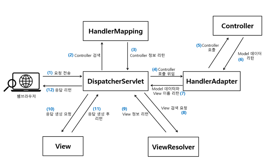 6. Controller의 Handler 메서드는 비즈니스 로직을 처리 완료 후 리턴 받은 Model 데이터를 다시 HandlerAdapter에게 전달