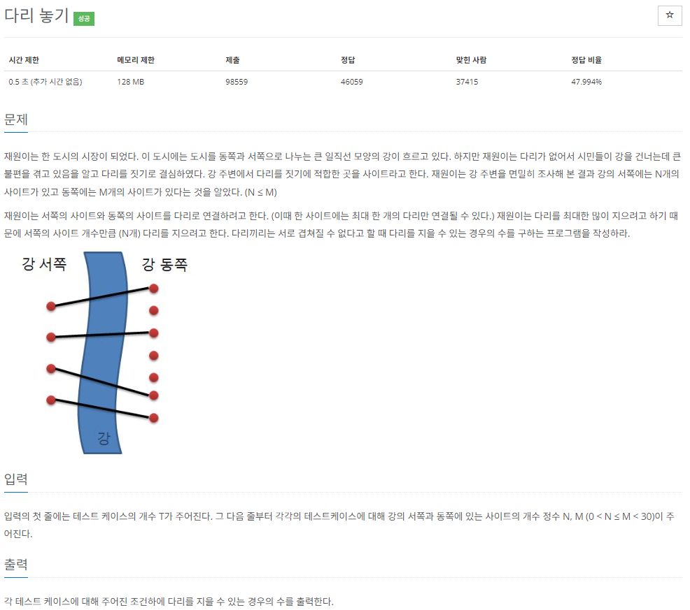 다리를 건설 할 때 서로 겹쳐질 수 없다는 점이 포인트이다.