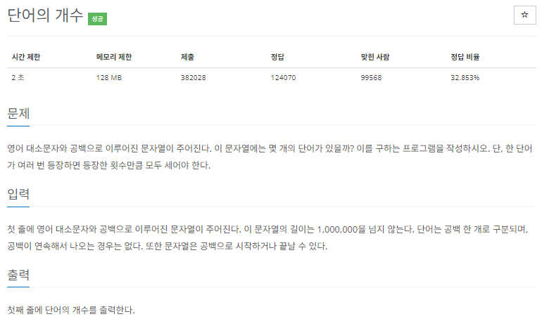 첫 줄에 영어 대소문자와 공백으로 이루어진 문자열이 주어진다. 이 문자열의 길이는 1,000,000을 넘지 않는다. 단어는 공백 한 개로 구분되며, 공백이 연속해서 나오는 경우는 없다. 또한 문자열